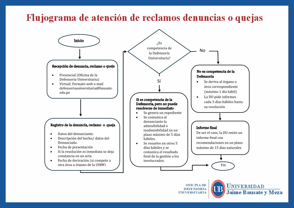 La Oficina de Defensoría Universitaria, es parte de la comunidad educativa de la Universidad Jaime Bausate y Meza, es un órgano autónomo, encargado de velar por el respeto de los derechos de todos los miembros de la comunidad universitaria (alumnos, administrativos y docentes) y velar por el principio de la autoridad responsable.